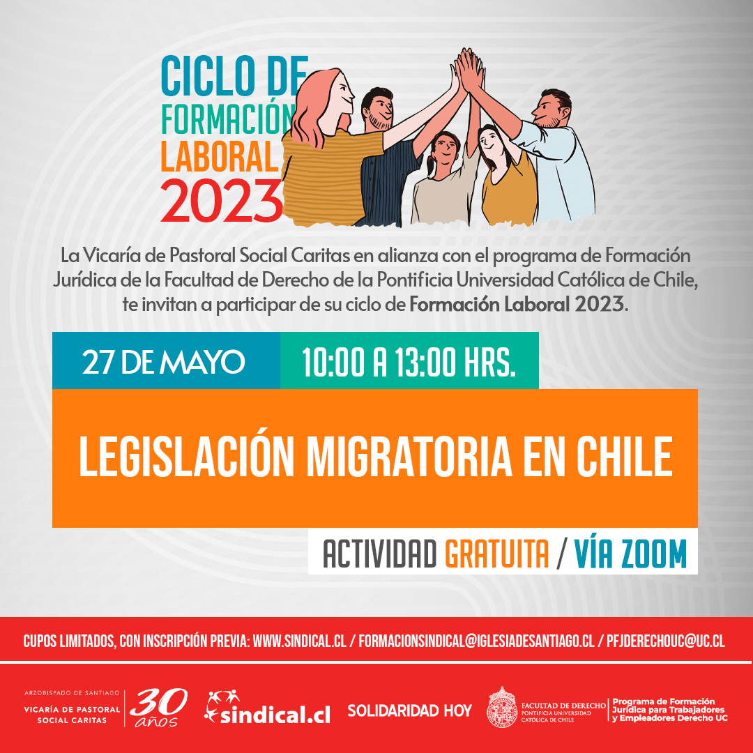 Vicaría de Pastoral Social Caritas en alianza con el Programa de Formación Jurídica de la Facultad de Derecho de la Pontificia Universidad Católica de Chile, te invitan a participar de su Ciclo de Formación Laboral mayo 2023. La charla es de carácter gratuito y cuenta con cupos limitados.