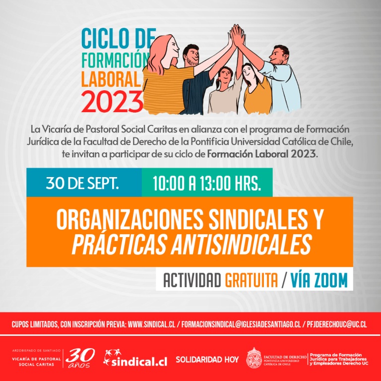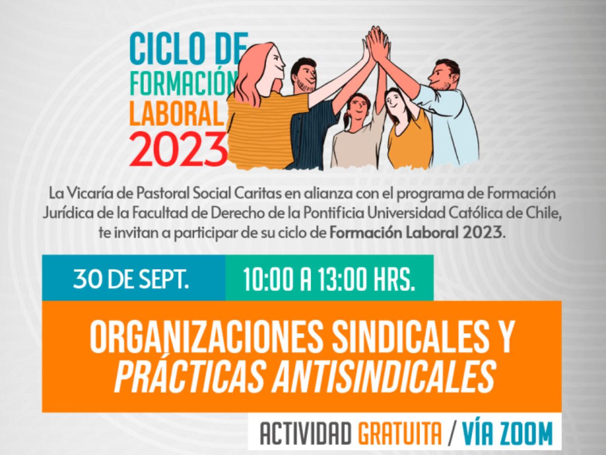 El Programa Diálogo Social de la Vicaría de Pastoral Social Cáritas, en alianza con el Programa de Formación Jurídica de la Facultad de Derecho de la Pontificia Universidad Católica de Chile, te invitan a participar de su Ciclo de Formación Laboral 2023. La charla es de carácter gratuito y cuenta con cupos limitados.