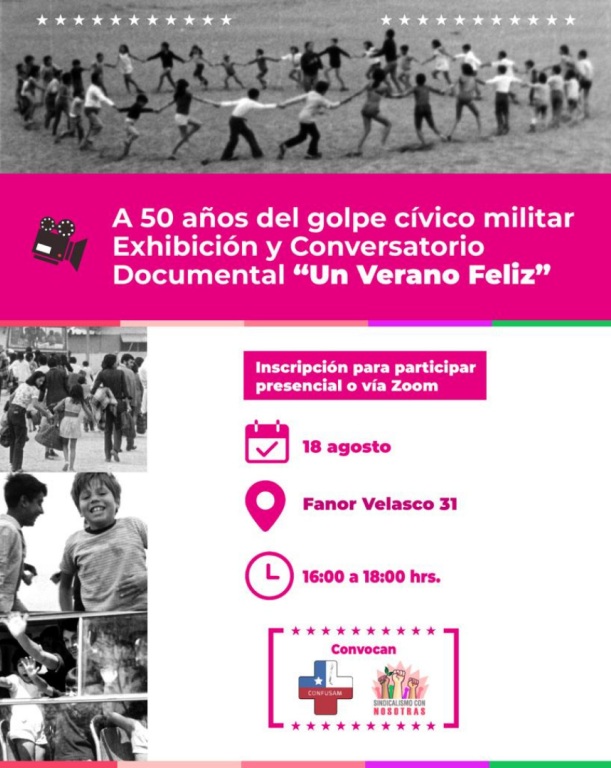 Sindicalismo con nosotras y la Confederación Nacional de Funcionarios de la Salud Municipalizada (Confusam) invitan a la exhibición y posterior conversatorio de “Un verano feliz”, docuficción que registra los balnearios populares, parte de la concreción de la medida número 29 del programa de Gobierno de la Unidad Popular, que buscaba volver el descanso y el acceso a las playas un derecho para todos y todas.