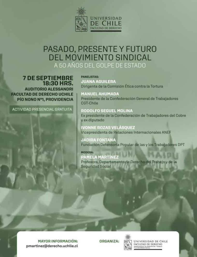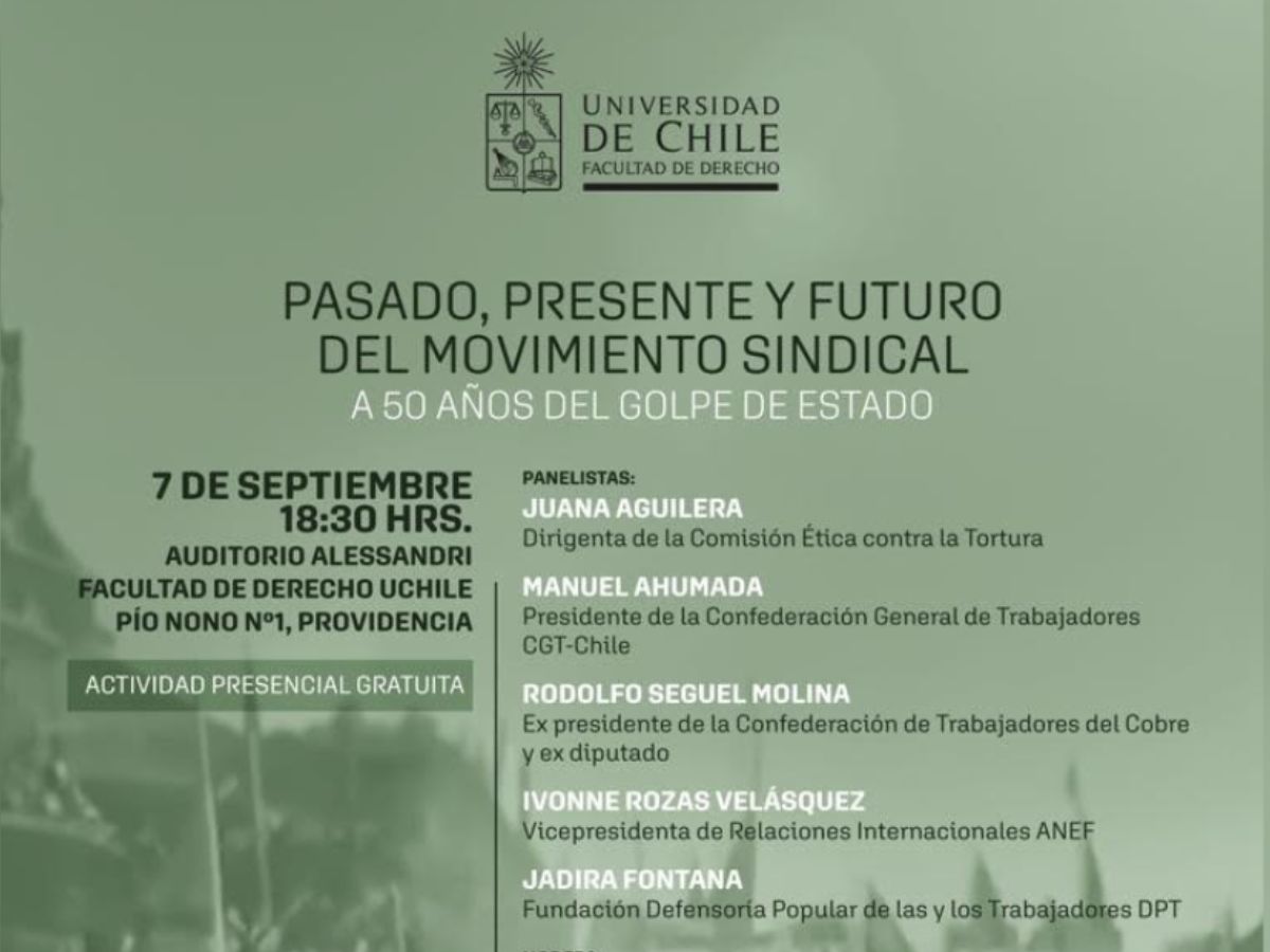 [06 de septiembre 2023] La actividad será presencial y gratuita, moderada por Pamela Martínez, profesora del Departamento de Derecho al Trabajo y de la Seguridad Social y contará con la presencia de Juana Aguilera, presidenta de la Comisión de Ética contra la tortura; Manuel Ahumada, presidente de la Confederación General de Trabajadores CGT-Chile; Rodolfo Seguel Molina, ex presidente de la Conferderación de Trabajadores del Cobre; Ivonne Rosas, Vicepresidenta de Relaciones Internacionales ANEF, y Jadira Fontana, Socióloga de la Defensoría Popular de las y los Trabajadores.