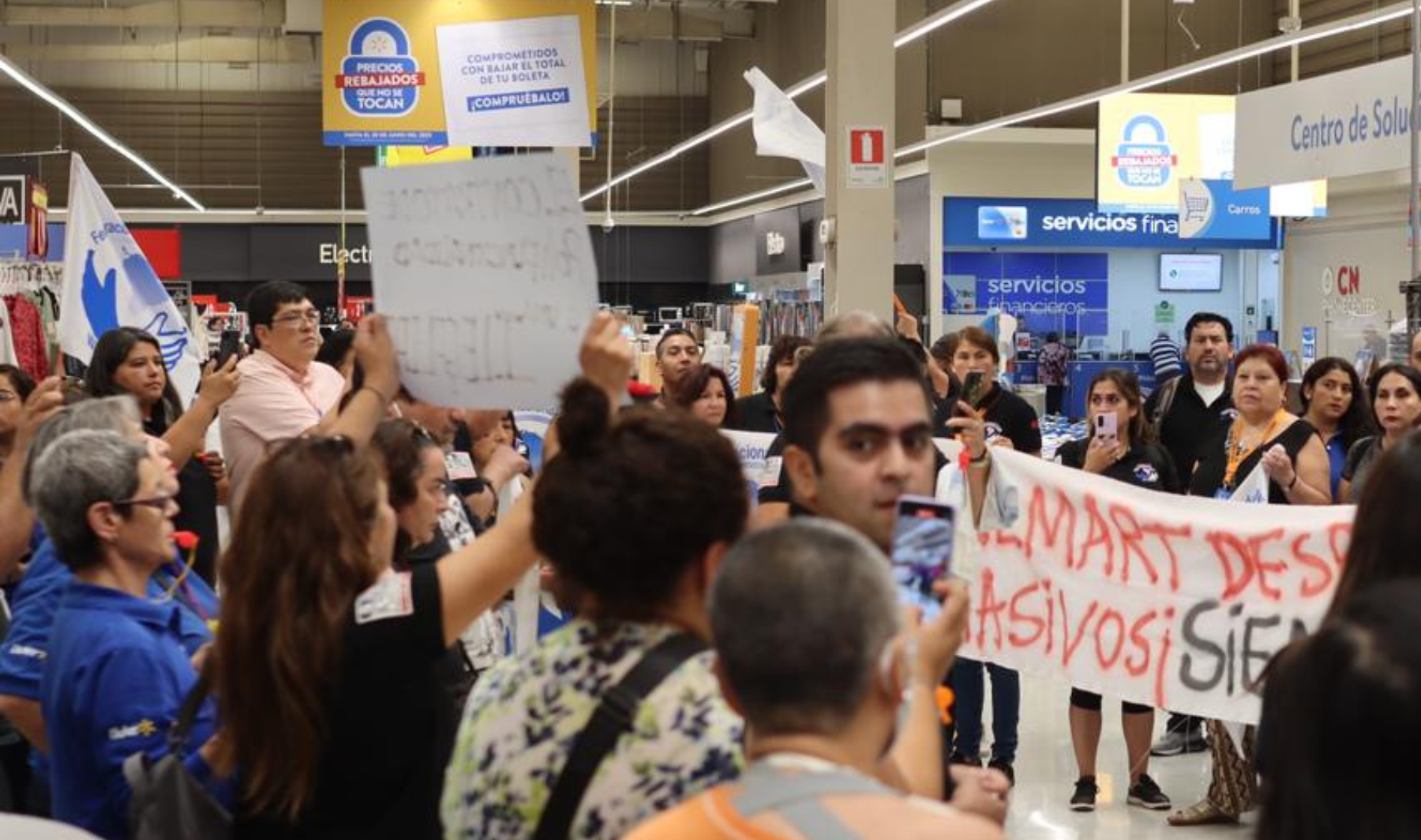 David Acuña, aseguró que esto es una arremetida empresarial: “Walmart pretende precarizar aún más los puestos de trabajo. Ya no existen los panaderos, carniceros, pasteleros… Walmart pretende que todos sean reponedores, operadores de tienda, el cual es un cargo ilegal”.